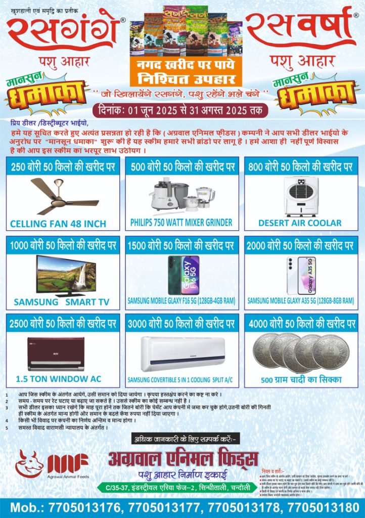 भारतीय पशु आहार उद्योग में विश्वसनीय नामों में से एक के रूप में, अग्रवाल एनिमल फीड्स पशुधन के लिए प्रीमियम गुणवत्ता वाला पोषण प्रदान करने के लिए प्रतिबद्ध है। वर्षों के अनुभव और गहन मूल्यों के साथ, हमारा मिशन अत्यधिक पौष्टिक, संतुलित और सुपाच्य पशु आहार का उत्पादन करके डेयरी किसानों को सहायता प्रदान करना है, जो दूध उत्पादन बढ़ाने और मवेशियों के स्वास्थ्य को बनाए रखने में मदद करता है।
